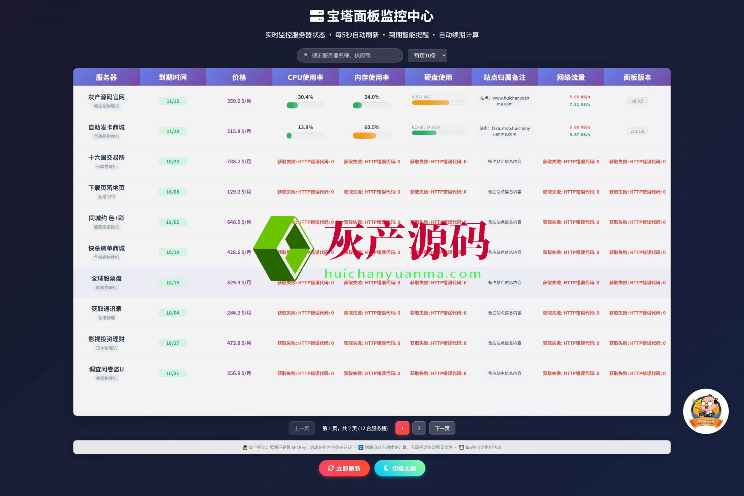自用的一个服务器动态监控源码,接口使用的宝塔面板api,被监控机器需要安装宝塔面板,修改“servers.php”内链接信息即可。